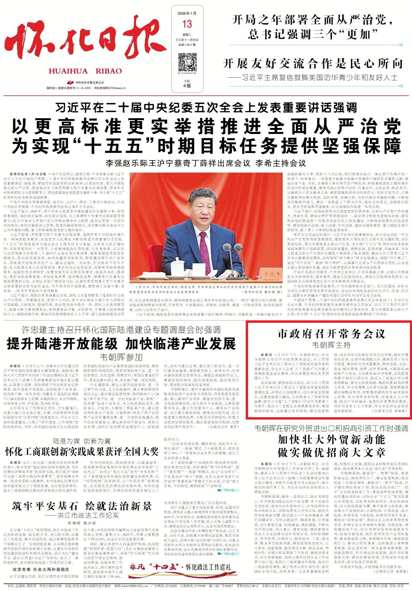 怀化日报全媒体讯1月12日下午,市委副书记、市长韦朝晖主持召开市政府常务会议,学习贯彻习近平总书记关于推动人工智能高质量发展的重要论述,传达学习全省“人工智能+”五大重点领域推进会会议精神,研究部署政府系统贯彻落实工作。