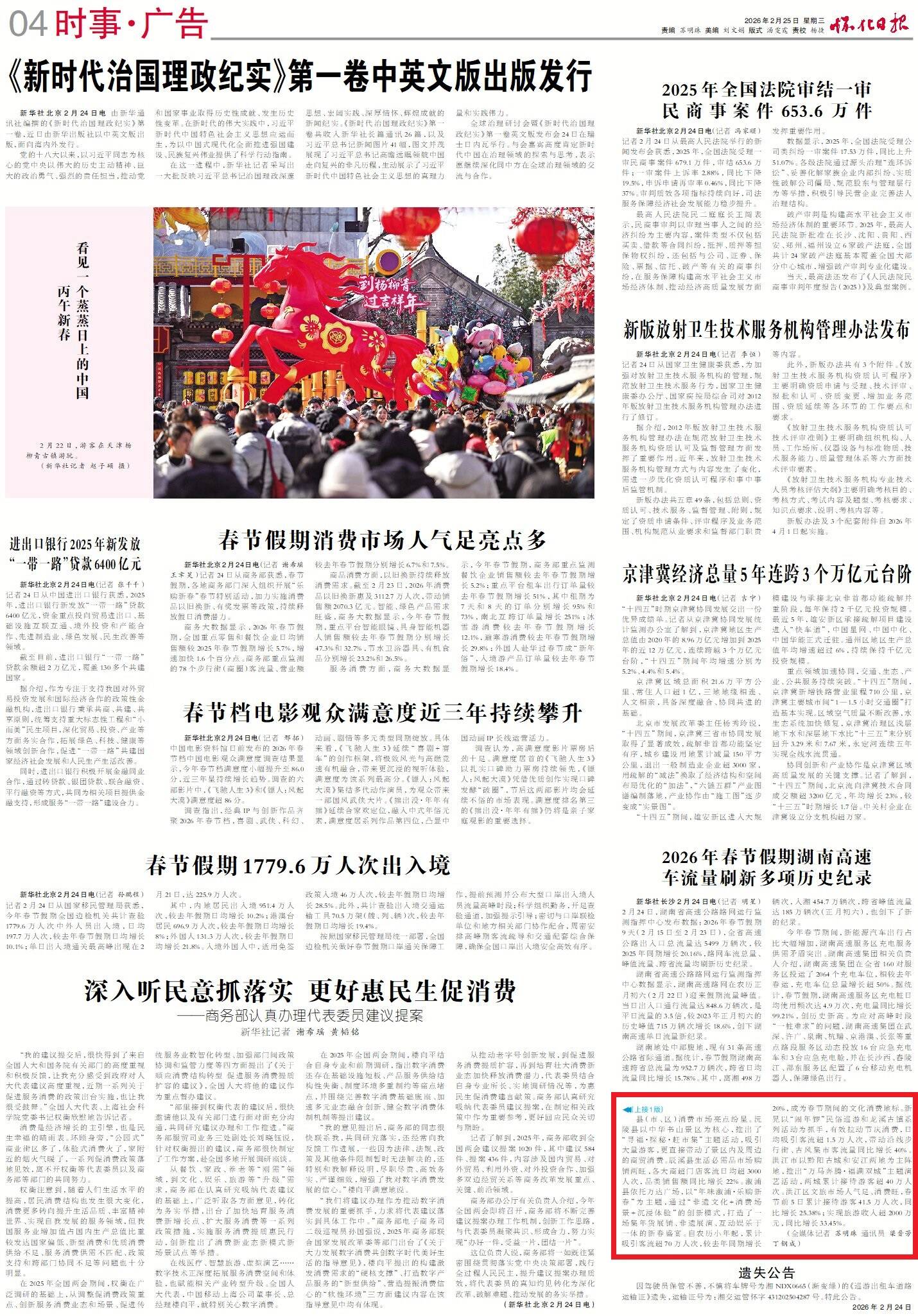 服务消费扩容提质。依托“乐享湖南 湘当有惠”消费券活动,引导中石化怀化分公司等重点油企推出易捷“充值有礼”活动。依托春节后3天市内高速公路返乡高峰,引导城区酒店、餐饮推出系列优惠套餐,实现跨区域“流量”变“留量”。“电影+”消费业态火热,依托《飞驰人生3》《惊蛰无声》《熊出没·年年有熊》等春节档大片热映,各影院主打亲民路线,推出储值赠券、特惠场次等春节特惠套餐,不限影片、不限场次,同时联动商圈品牌推出赠送免费停车等“票根福利”,实现“观影+消费”的场景融合,市民观影热情持续高涨。